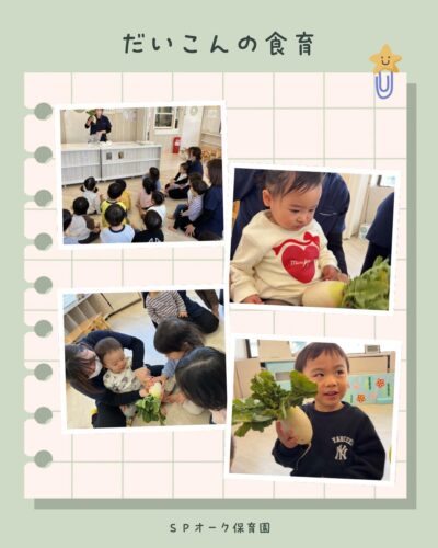 〜大根の食育〜大根に触れて見ました!見て🖐️さわって匂いをかいで「冷たいね」「大根の匂いする」とそれぞれ感じたことを表情やしぐさで伝えてくれました️紙芝居やお話を通して、大根が土の中でどう育つのかも知り、子どもた・・・
