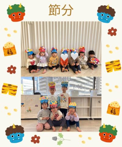 節分〜新年度0歳児募集中〜 節分ごっこをしました節分前から、絵本や鬼のお面製作で鬼をみてを会える事を楽しみにしていた0歳児さんたち🤭 風船鬼に豆に見立てた新聞紙を、「おには外〜」「福はうち〜」と豆まきを楽しんだり・・・