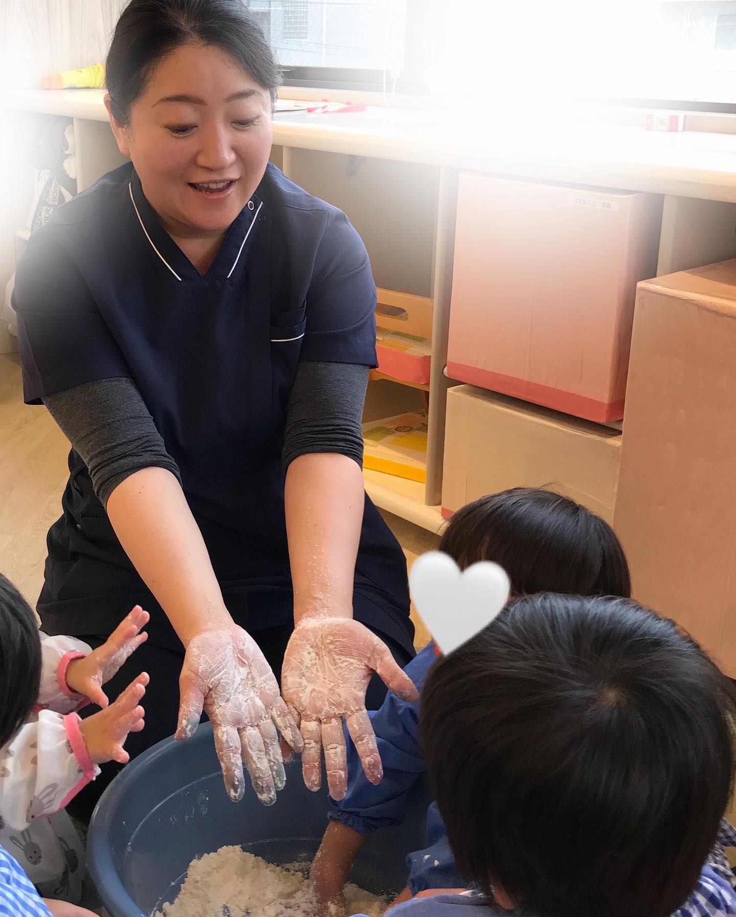 久しぶりに小麦粉粘土をしました。サラサラの小麦粉の手触りをみんなで楽しみ、白い手を見せ合いっこお水を加えて色を付けるとカラー粘土の出来上がり保育者がギュッと握りしめると、指の間からムニュっと出てきた粘土に笑顔が溢れました️細くのばしたりぺっちゃんこにしてみたり♪「でんでんむし♪」「おだんご!」「ドーナツ」それぞれ好きな物を作って夢中で遊びました#一歳 #企業主導型保育施設 #室内遊び #茨木市保育園 #spオーク保育園 #保育園 #茨木市 #小麦粉粘土 #保育園探し #1歳児
