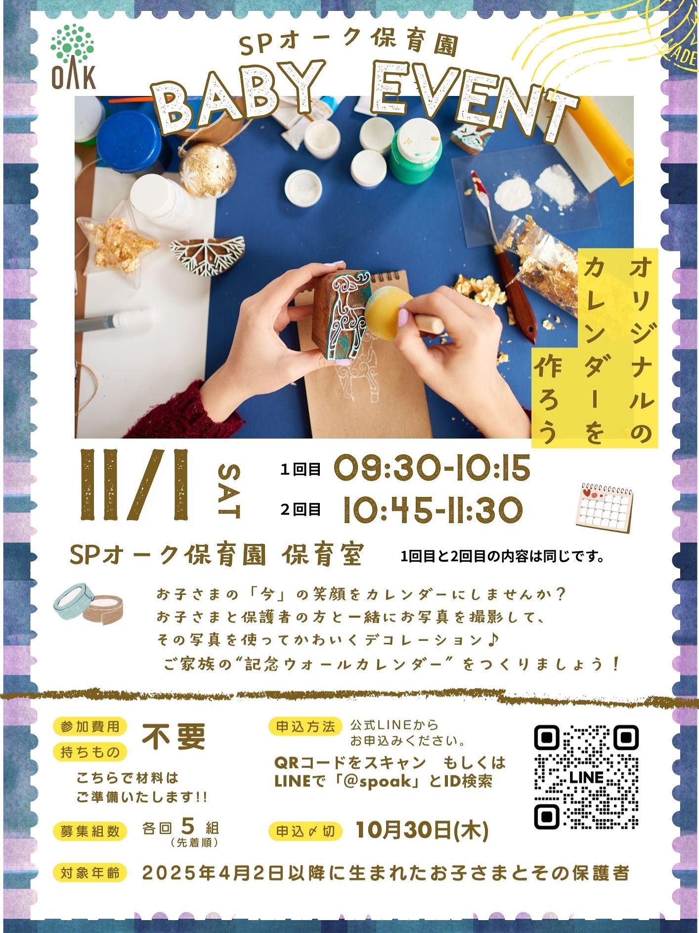 赤ちゃんと作る手作りカレンダー当園にご興味のある方を対象に、お子さまとの写真で作る手作りカレンダー のイベントを開催します 赤ちゃんとの思い出を形に残したい方 保育園の雰囲気を知ってみたい方対象年齢:2025年4月2日以降に生まれたお子さま 日時:11月1日(土) 場所:SPオーク保育園 ご予約・お問い合わせは 公式LINE まで#spオーク保育園 #スマイルプラン #茨木市保育園 #企業主導型保育施設 #0歳児 #赤ちゃんイベント #手作りカレンダー #思い出作り #オリジナルカレンダー